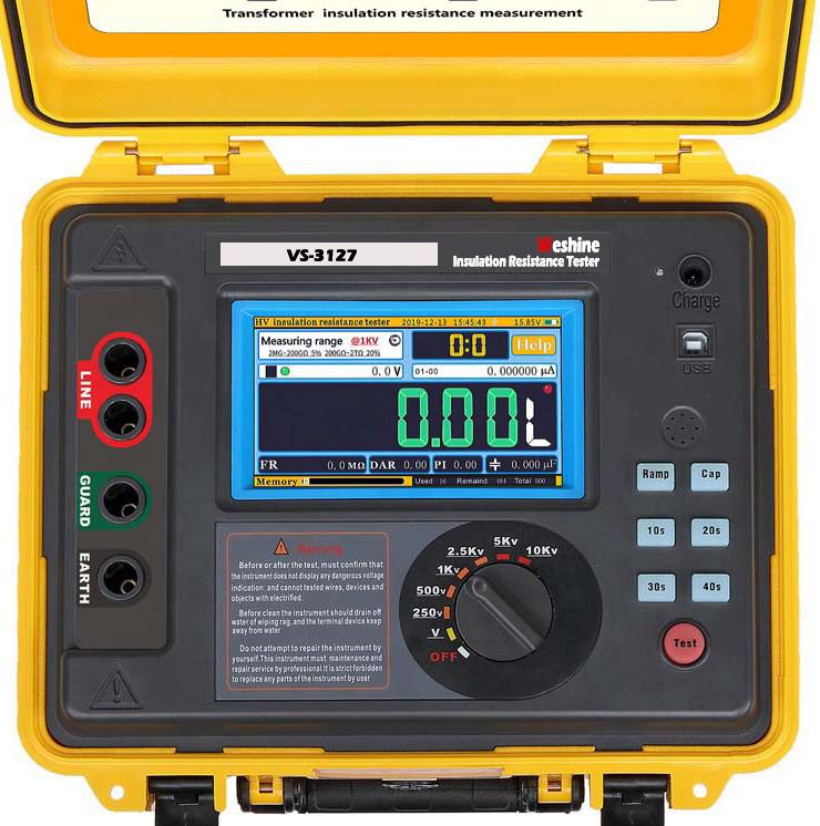 Weshine® VS-3127 работает от аккумулятора.Испытание изоляции трансформаторас цифровым и аналоговым индикатором дуги, предназначен для испытаний сопротивления изоляции высокого напряжения при техническом обслуживании и ремонте кабелей, вращающихся машин, трансформаторов, распределительных устройств и промышленного применения.
